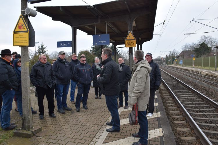 Weiter ging es zum Bahnhof. Ab 2017 wird hier die Modernisierung der Bahnsteige stattfinden. Die vom RMV zukünftig eingesetzten Züge, machen eine Erhöhung der Bahnsteige notwendig. Nach dem Umbau werden beide Bahnsteige barrierefrei erreichbar sein. Die Rampen zur Unterführung werden neu gestaltet und abgeflacht, so dass die Unterquerung der Gleisanlage für ältere Ortsbürger und mit dem Fahrrad leichter wird.