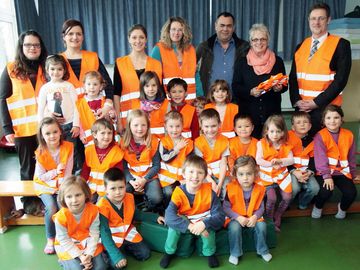 Durch die gut sichtbaren Westen sollen die Kindergartenkinder und Erzieherinnen auf ihren Spaziergängen, besonders jetzt in der dunklen Jahreszeit, für die übrigen Verkehrsteilnehmer besser sichtbar sein.