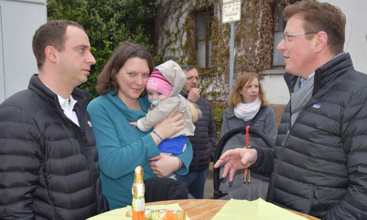 CDU Bundestags-Wahlkreiskandidat Stefan Sauer (rechts) im Gespräch mit jungen Eltern.