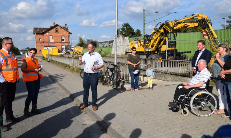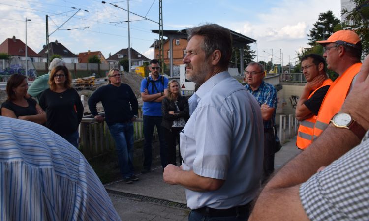 Zusammen mit Vertretern der DB Station & Service und dem ausführenden Bauunternehmen erklärt Bürgermeister Thomas Raschel den Stand der Bauarbeiten.